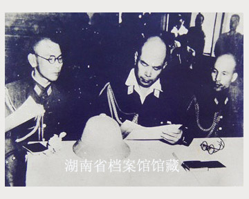 这是洽降席上日军的代表:日军副总参谋长今井武夫(中)、参谋桥岛芳雄中佐(左)、参谋前川冈雄少佐(右)。